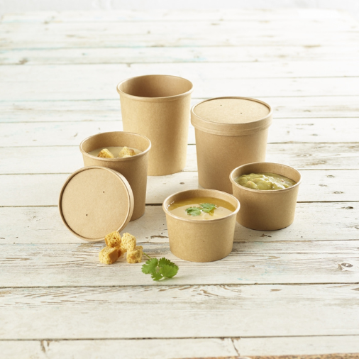 Large 26oz sized Brown soup cups, natural unbleached appearance. These are ideal for any hot or cold meals, made from thick 350gsm paper, fully microwave and freezer safe. Available with either a paper vented lid or a tight fitting plastic lid depending on your requirements.